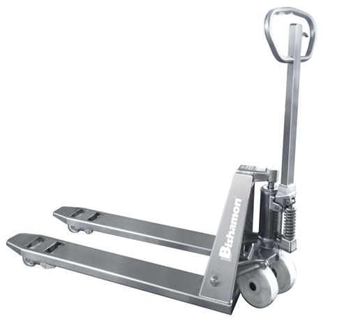 オールステンレス仕様のハンドパレットトラックを展示しています。