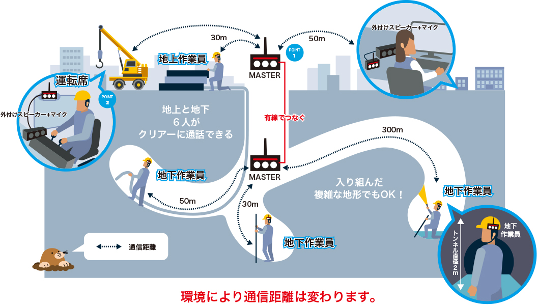 さらに、地上と地下にそれぞれマスター機を設置し、それらをケーブルで物理的に接続することで、通常は無線が遮断されるような入り組んだ環境下でも、地上と地下の間でクリアな通話環境を構築することができます。