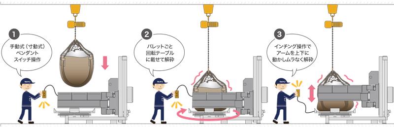 フレキシブルコンテナ(フレコン)に入った原料が固まった場合に使用する解砕装置です。